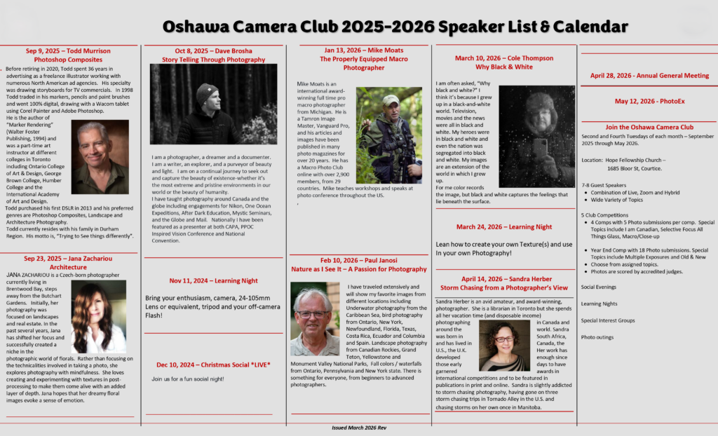 The Oshawa Camera Club is a community of photography enthusiasts in Oshawa, Ontario. We welcome photographers of all experience levels and offer monthly meetings, competitions, educational presentations, and opportunities to learn, share, and grow a passion for photography. Members enjoy a supportive community focused on creativity, learning, and sharing photography in the Durham Region.